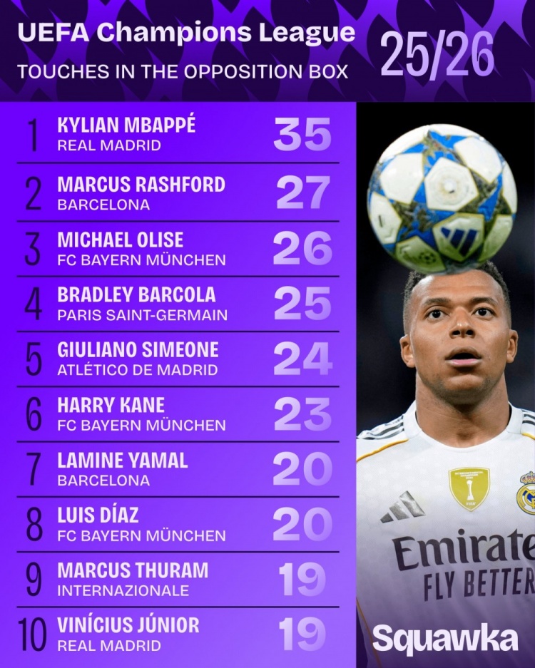10月23日讯 本赛季欧冠联赛阶段已战罢3轮,Squawka统计了到当今鸿沟对方禁区内触球次数榜单,姆巴佩35纪律一,拉什福德27纪律二。
