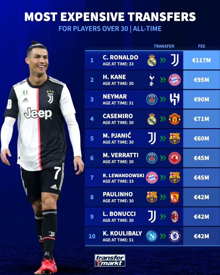 30岁以上球员转会费榜:C罗33岁1.17亿欧居首 凯恩内马尔分列二三