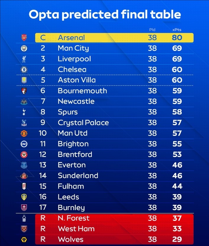 OPTA臆测英超最终排行:阿森纳80分夺冠,曼城赤军69分,曼联第10