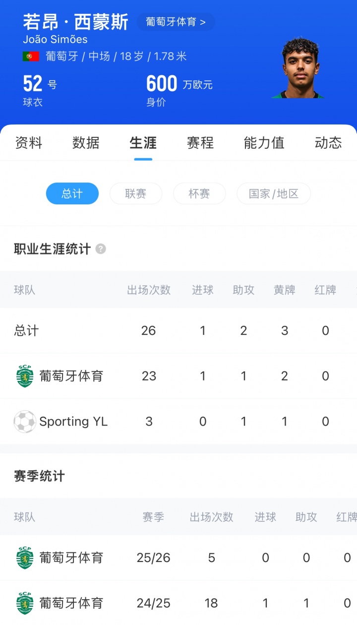 若昂-西蒙斯现身价600万欧,上赛季他为葡体一线队出场18次,孝顺1球1助,他与葡体的公约在2030年到期,解约金8000万欧。