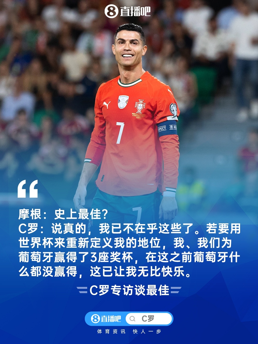 C罗:说竟然,我已不在乎这些了。看过太多访谈,当今无论我说什么皆不会让东说念主诧异,事实自己就能评释一切。