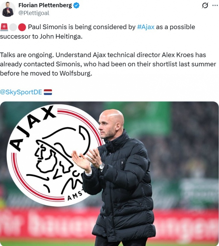 报谈称两边谈判正在进行中,阿贾克斯的时代总监亚历克斯-克罗斯一经联系了西蒙尼斯。客岁夏天,西蒙尼斯曾是阿贾克斯选帅的贪图之一,但最终他采用了加盟沃尔夫斯堡。