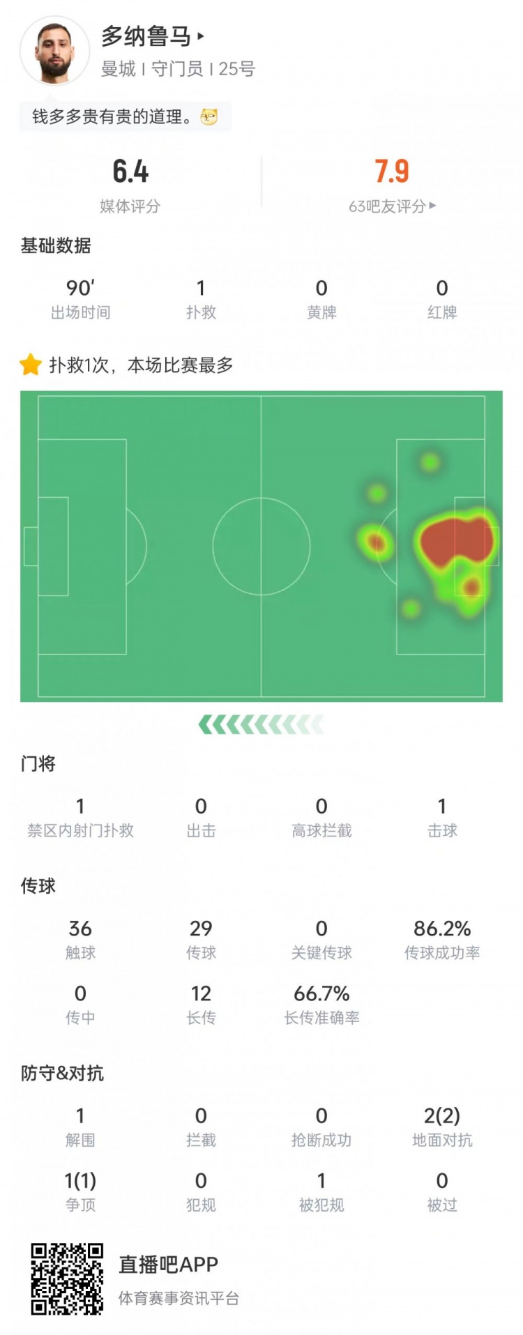 多纳鲁马数据:作念出1次扑救丢4球,长传收效用66.7%,获评6.4分