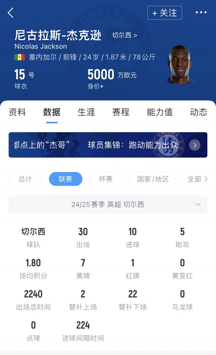 杰克逊现年24岁,当今德回身价5000万欧,切尔西2023年破耗3700万欧从比利亚雷亚尔将其引进。上赛季杰克逊为切尔西出战38场成绩16球5助。