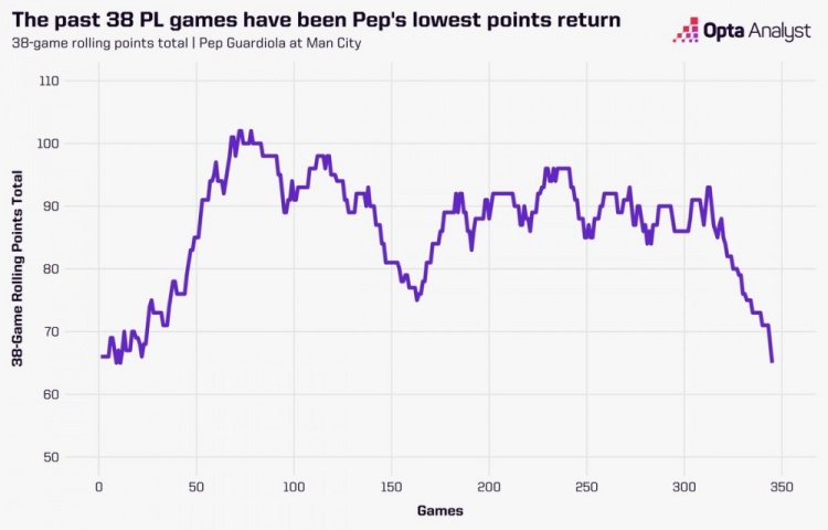 能否回暖?曼城近38轮联赛仅获取65分,是2016年11月以来最低