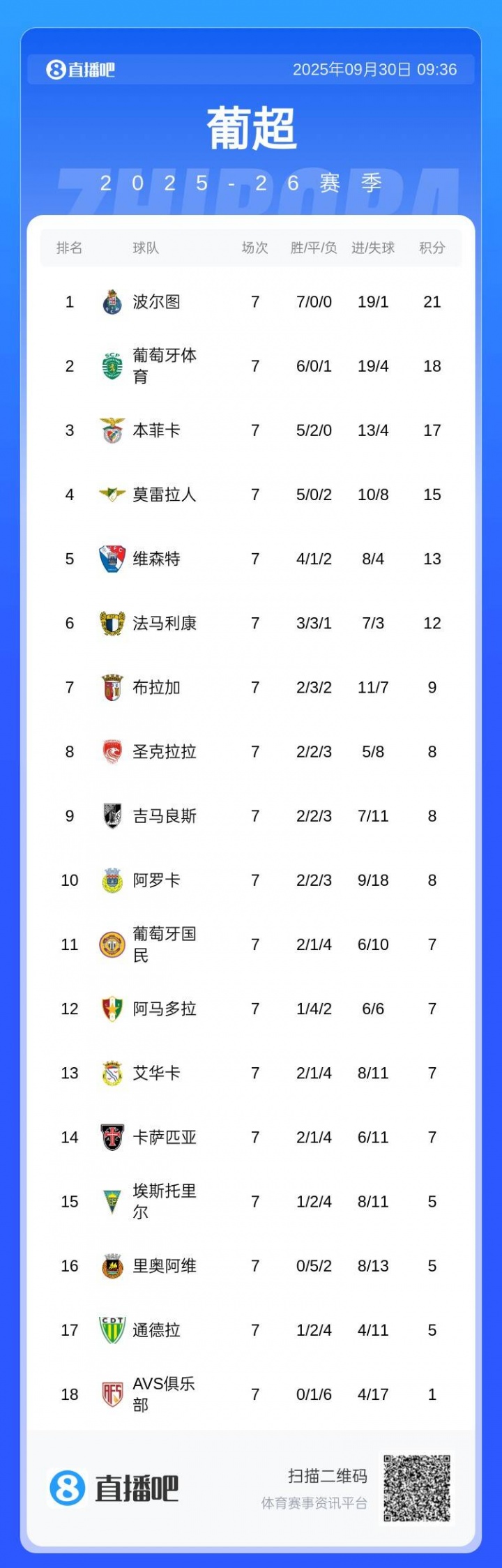 09月30日讯 葡超第7轮,波尔图4-0大捷阿罗卡,联赛7连胜狂轰19球仅失1球。