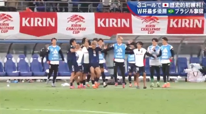 10月14日讯 麒麟杯外洋友谊赛,日本主场让二追三逆转五星巴西,赛后日本替补席果真全员冲入场内心计庆祝。这是他们历史初次打败巴西这一劲敌。