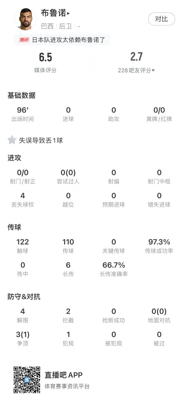 此役,巴西首发中卫布鲁诺献技灾难级别推崇,先是腿软送敌手单刀,尔后又突围时失慎爆射自家球门,径直匡助日本队完成让二追三。