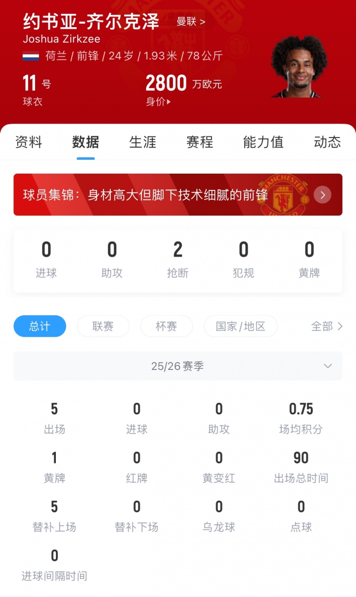 曼联对王人尔克泽的要价在在3500万欧至4000万欧之间,王人尔克泽与曼联的左券抓续到2029年,本赛季仅登场5次,合计90分钟。