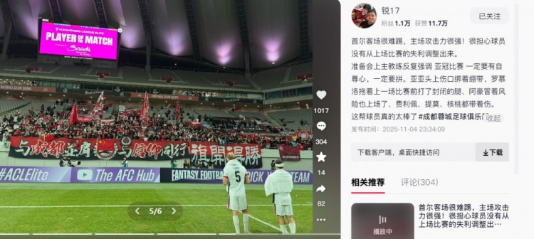 11月5日讯 亚冠精英联赛第四轮,成皆蓉城客场0-0战平首尔FC。赛后,蓉城助教甘锐发文称,准备会上主阐发反复强调亚冠一定要拼,这帮球员竟然太棒了。
