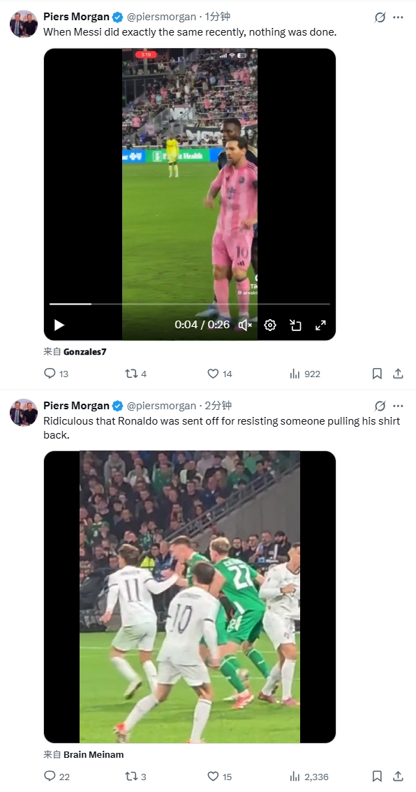 此前,摩根曾在社媒屡次声援染红的C罗,划分晒出C罗与梅西的视频,并暗示C罗因为抵拒他东谈主拉扯球衣而被红牌罚下十分差错,此外梅西最近通常的当作却莫得遭到刑事攀扯。