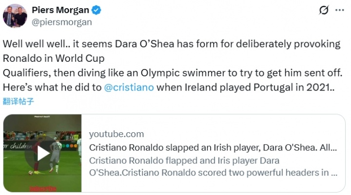 此外,摩根还曾暗示C罗比赛中肘击的爱尔兰队后卫奥谢早有前科,他曾辞世初赛特意寻衅C罗而被后者击打手臂。