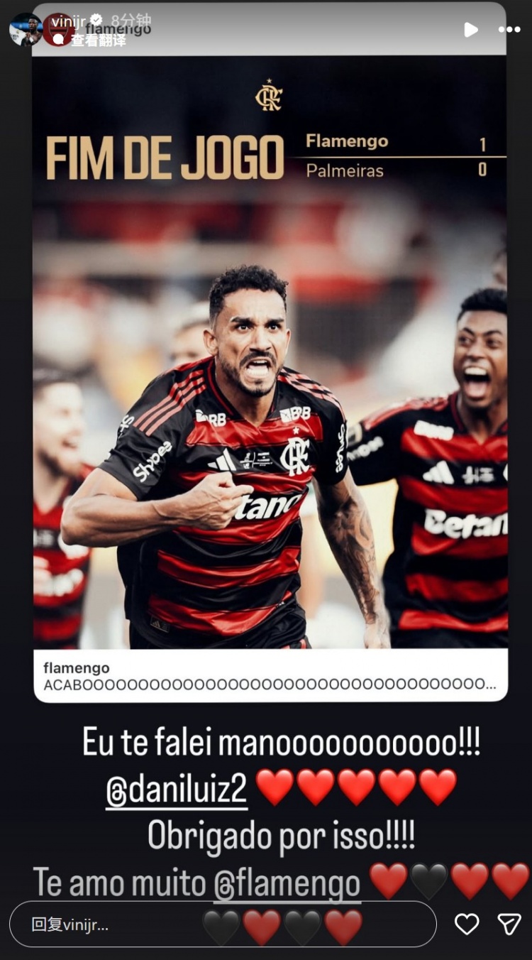 维尼修斯也在社媒转发海报祝福老东家弗拉门戈夺冠,配文写谈:“我早就跟你说过了昆季,达尼洛!!!特殊感谢这一切!!!我太爱你了,弗拉门戈!”