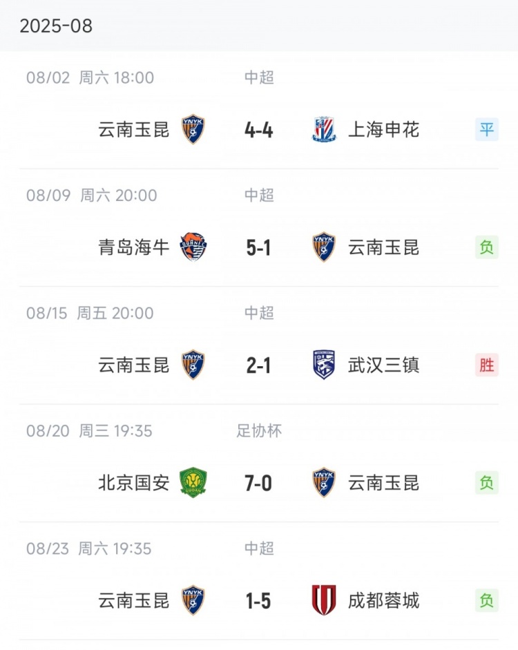 1-5、0-7、1-5!云南玉昆8月份的比赛并吞大比分丢球
