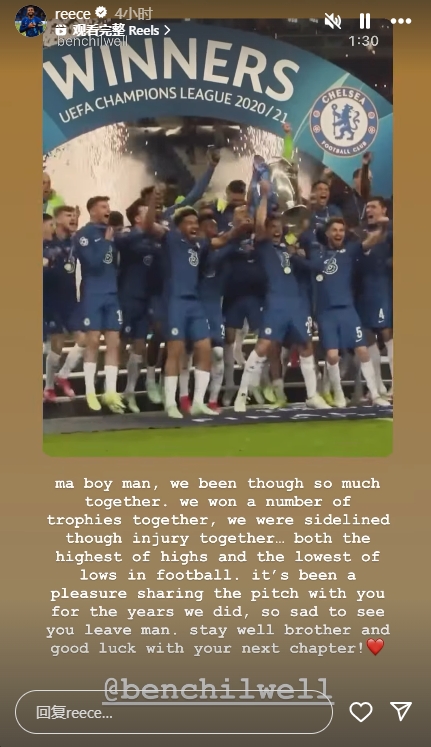 09月04日讯 切尔西功勋后卫奇尔维尔今夏恒久转会离队,曾一都夺欧冠冠军的蓝队列长詹姆斯在社媒告别了奇尔维尔。上赛季,他们两东说念主即是切尔西终末的两位欧冠冠军成员。