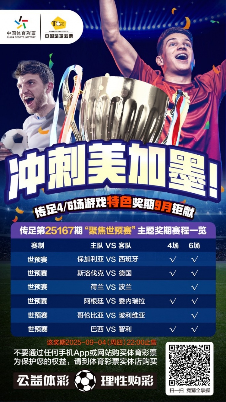 第25167期传足4/6场游戏秉性奖期照旧于2025年8月31日20:00开售,将于2025年9月4日22:00停售,并于9月5日开奖,其中保加利亚VS西班牙、斯洛伐克VS德国、阿根廷VS委内瑞拉和巴西VS智利为4场进球游戏竞猜赛事。