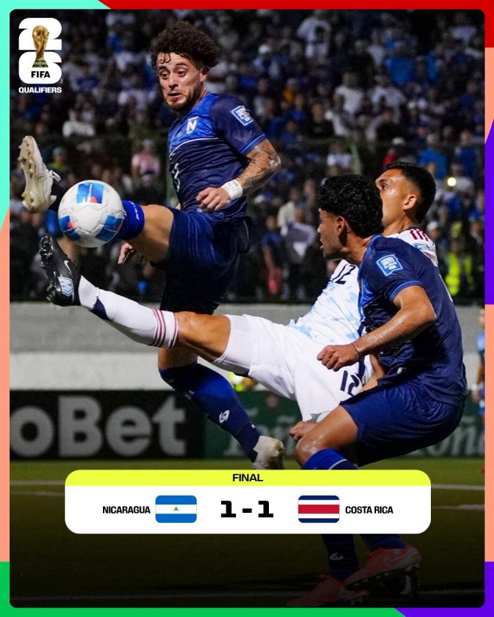 攻破纳瓦斯大门!尼加拉瓜FIFA第130,10东说念主作战1-1逼平哥斯达黎加