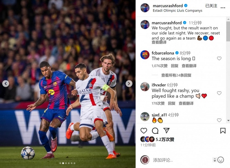 拉什福德社媒晒出比赛相片,并写谈:“咱们竭力构兵,但昨晚的比赛恶果不如咱们所愿。”