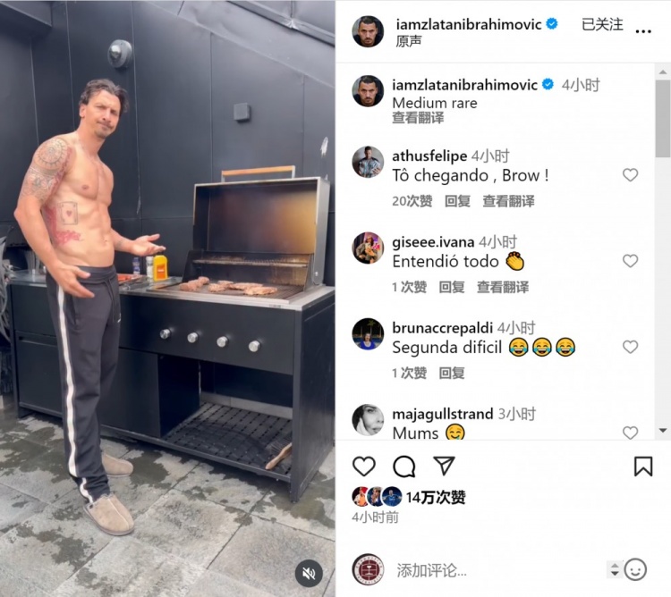 肌肉线条仍是彰着!44岁伊布晒赤裸上身烤肉视频:五分熟