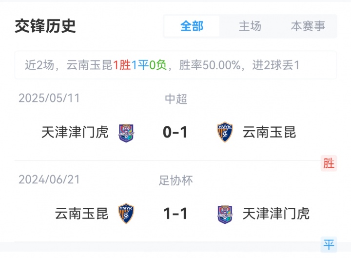云南玉昆8胜8平10负积32分,名次中超第10;天津津门虎12胜7平7负积43分,名次中超第6。