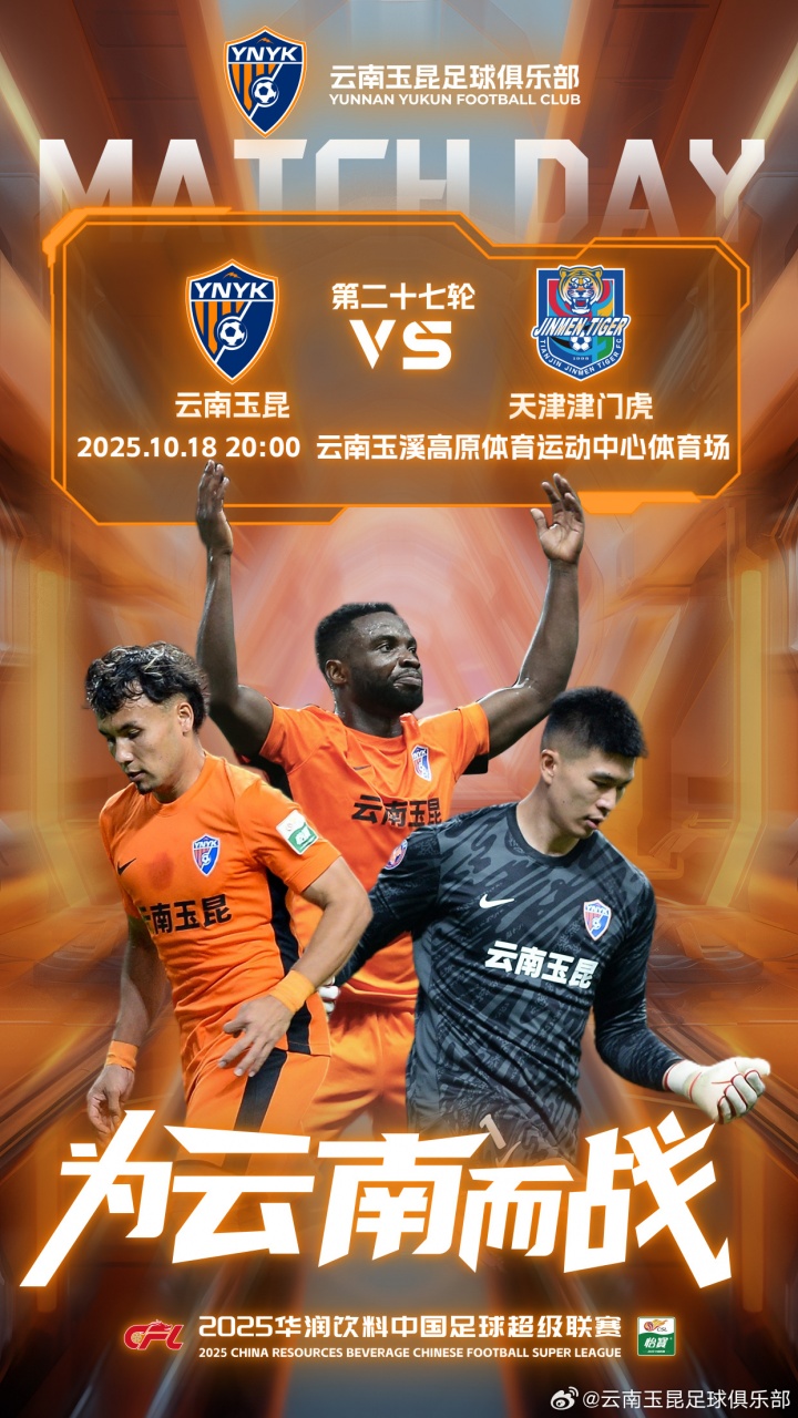 10月18日讯 北京时间20点,中超第27轮,云南玉昆主场迎战天津津门虎,赛前两边公布首发。