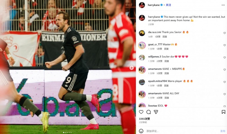凯恩也在赛后通过社媒晒出我方进球后的庆祝照,并配文:“这支球队永不烧毁!没拿到咱们思要的到手,但从客场带走要紧一分💪”。