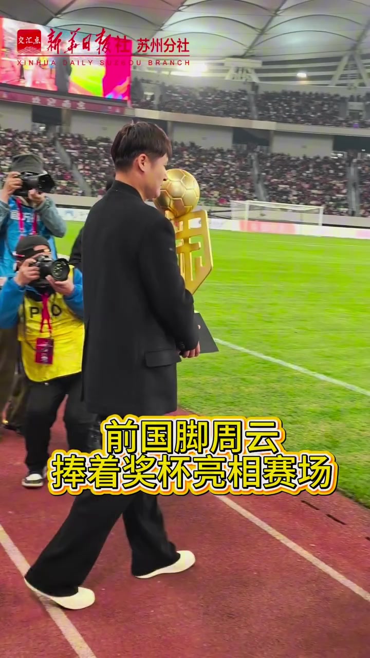 新华日报社苏州分社官方发布现场视频,在比赛运行前,前江苏球员周云捧着奖杯亮相双城赛现场。