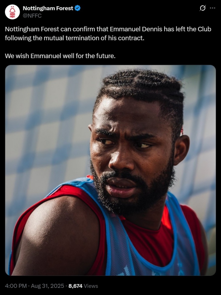 8月31日讯 诺丁汉丛林官方阐发,伊曼纽尔-丹尼斯在协议终结后离队。