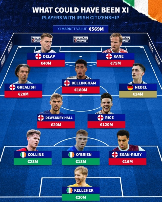 德转爱尔兰血缘球员最好阵:凯恩领衔,赖斯、贝林厄姆在列