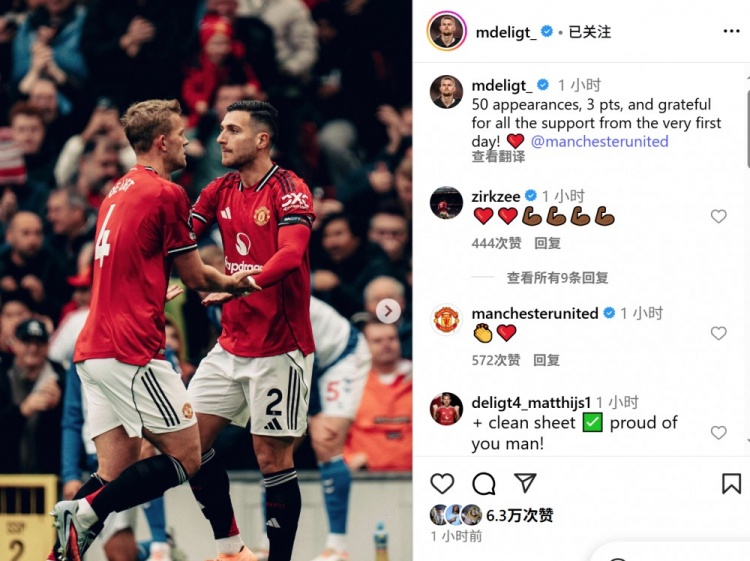 曼联后防铁闸!德里赫特:50次出场,拿下3分,感谢扫数撑握!
