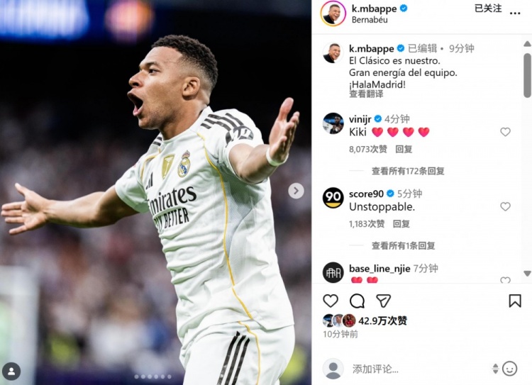 本场比赛姆巴佩破门,赛后他也在个东说念主社媒晒出庆祝进球像片,配文写说念:“国度德比得手属于咱们,球队展现出很棒的活力,皇马加油!”