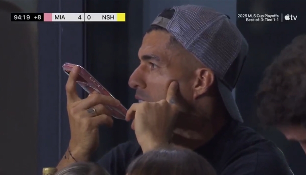 看比赛太纵脱了!迈阿密4球逾越,苏亚雷斯场边拿入辖下手机聊天