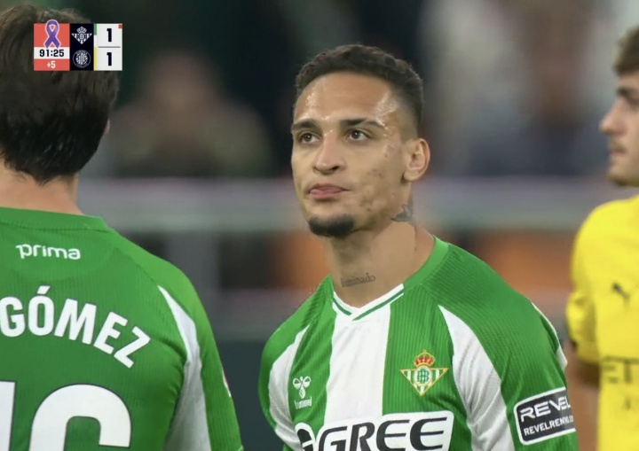11月24日讯 贝蒂斯本轮1-1战平赫罗纳,第90分钟,安东尼一个倒勾行为踢到敌手头部,裁判看VAR后将他直红罚下。
