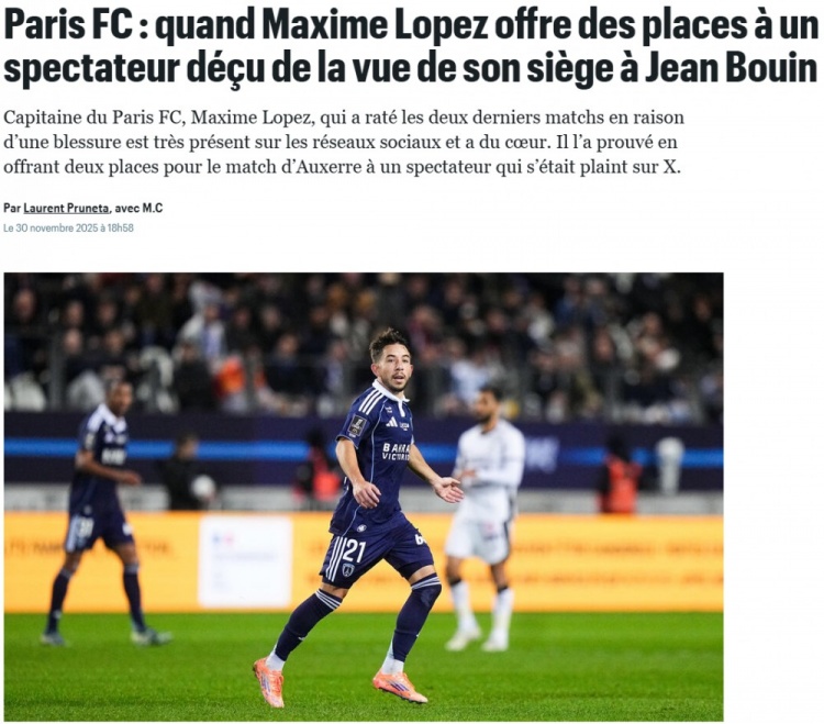 12月2日讯 《巴黎东谈主报》报谈,巴黎FC队长马克西姆·洛佩斯在搪塞媒体上私信敌手球迷,给对方送票。