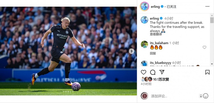 这是哈兰德出战的第100场英超比赛,他获取进球,但曼城落败,赛后哈兰德在外交媒体上写谈:“休赛期后讲和赓续,感谢球迷在客场一如既往的复古。”